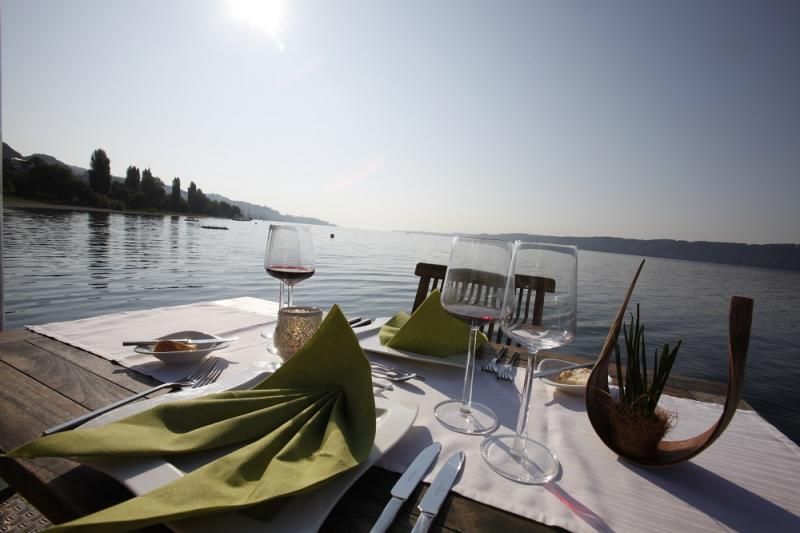 Essen im besonderen Flair von Schlössern und Burgen: Burg-Café in Meersburg, Deuring Schlössle in Bregenz, Schloss Wartegg in Rorschacherberg, Essen am Seeufer - Schloss Montfort in Langenargen, Bad-Hotel in Überlingen, Restaurant Strandcafé Mettnau in Radolfzell,